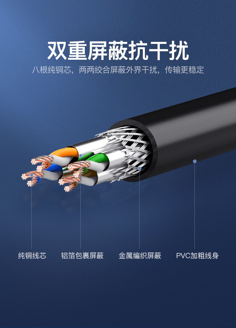 傳輸性能滿足并優(yōu)于六類標(biāo)準(zhǔn)。完全支持千兆以太網(wǎng)應(yīng)用,最高傳輸頻率350MHz,為未來應(yīng)用提供額外帶寬。中心為十字骨架隔離設(shè)計(jì),增強(qiáng)了帶寬和網(wǎng)絡(luò)性能。導(dǎo)體采用23AWG優(yōu)質(zhì)無(wú)氧銅線(99.99%);采用鋁箔總屏蔽結(jié)構(gòu),改善線纜外部串?dāng)_及衰減;線纜成軸包裝,保護(hù)結(jié)構(gòu)穩(wěn)定。