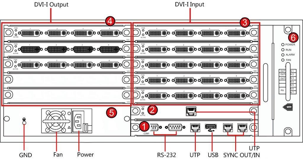 | 2/3.輸入業務板插槽 | 6 個輸入板槽位,支持 VGA、DVI、HDMI、BNC、YPbPr、HDBaseT、DP 及 IP 源多種信號解碼 |
